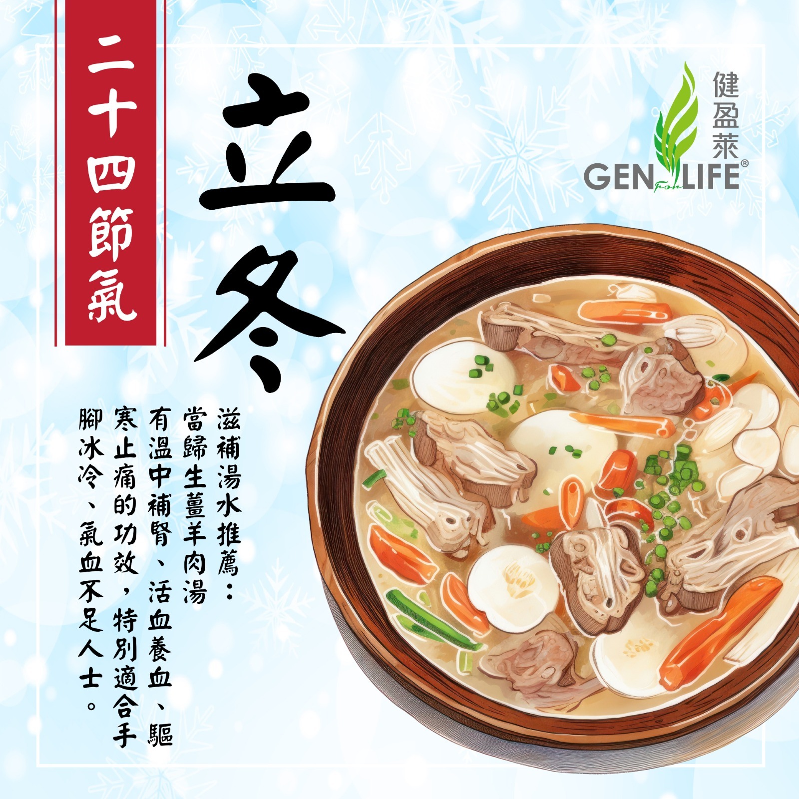 立冬最經典的補身湯品,非「當歸生薑羊肉湯」莫屬。這道湯品源自《金匱要略》,有溫中補腎、活血養血、驅寒止痛的功效,特別適合手腳冰冷、氣血不足人士。