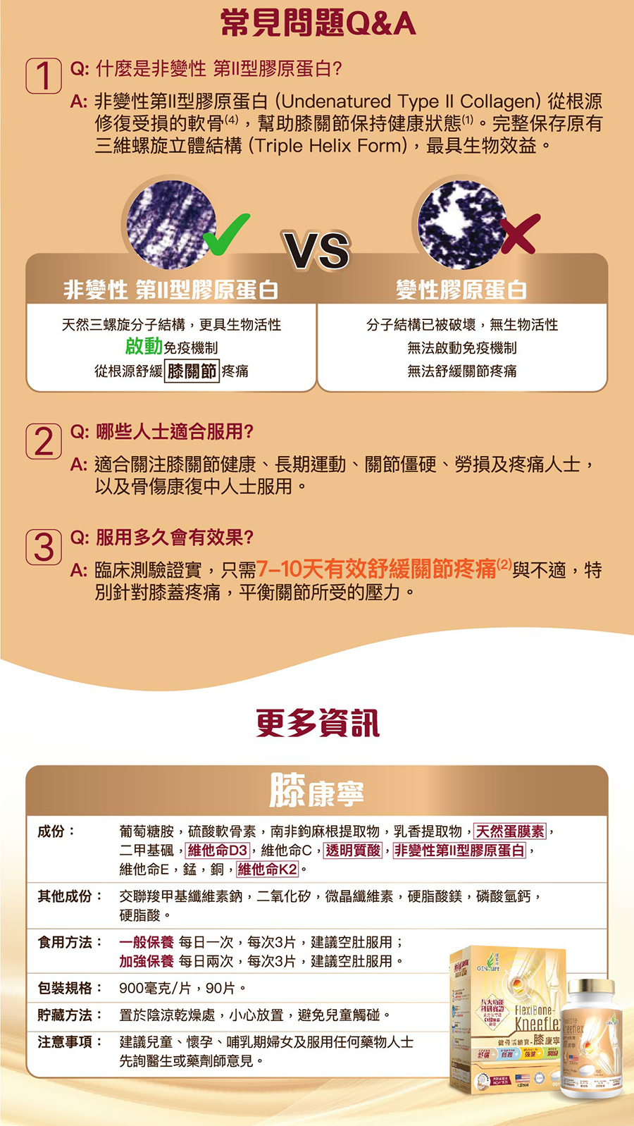 | Main Ingredients | This product consists of Undenatured Type II Collagen, MK-7 (A more active vitamin K2), Natural Eggshell Membrane, Hyaluronic Acid and ten nutrients for joint and bone to support knee health. This formula can reduce joint pain, lubricate the knee joint, improve joint flexibility and stiffness and increase bone density. Continue to take this product can recover cartilage and solve the knee problem overall. |