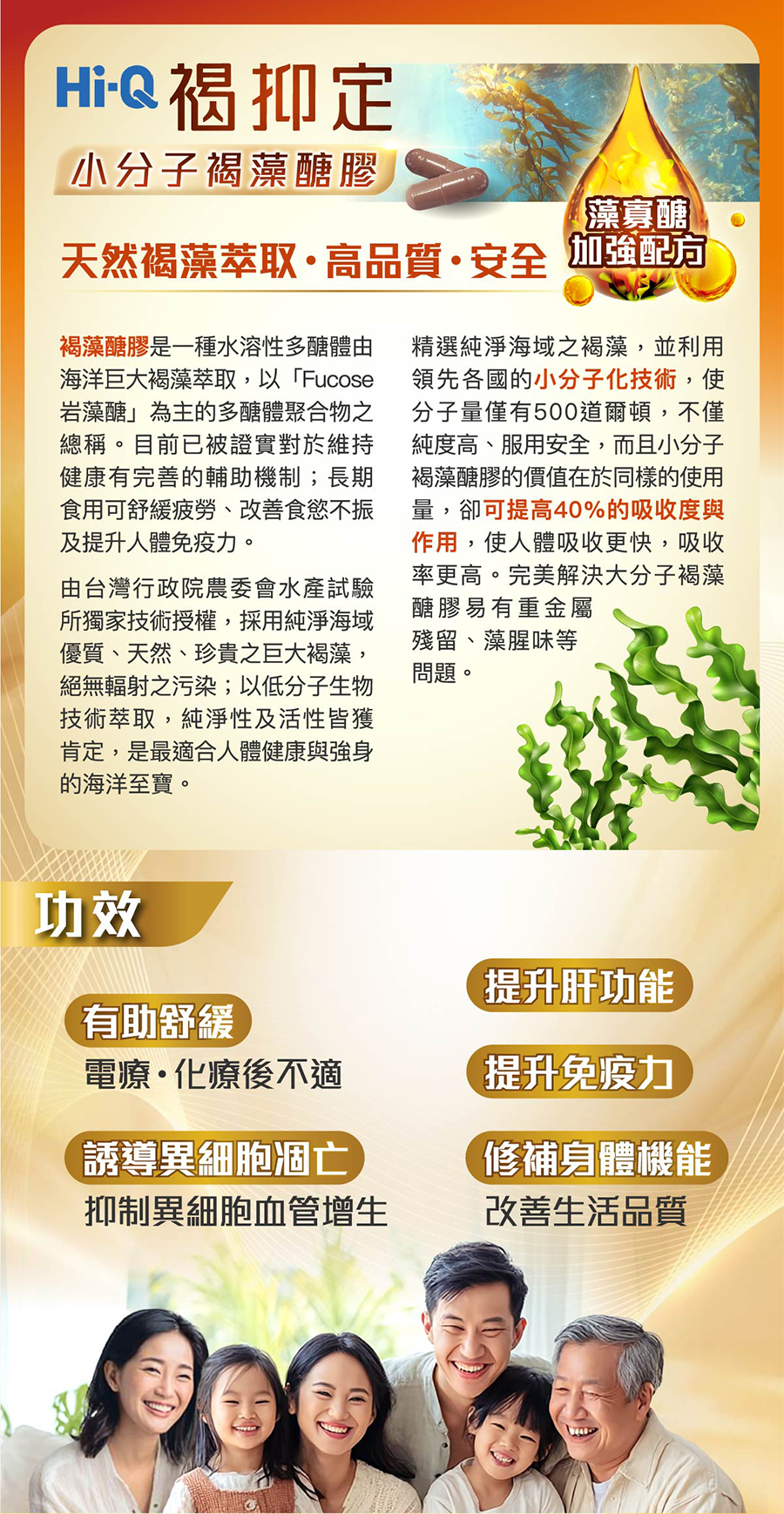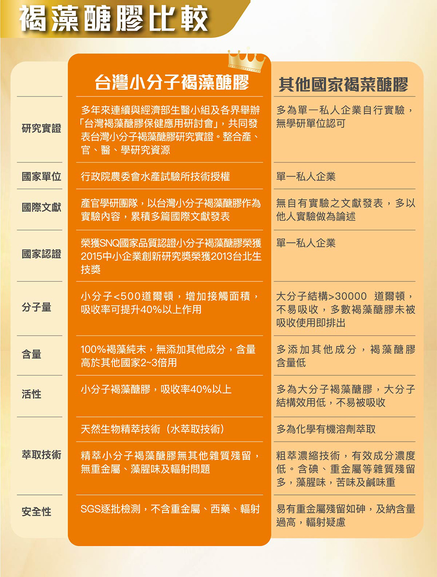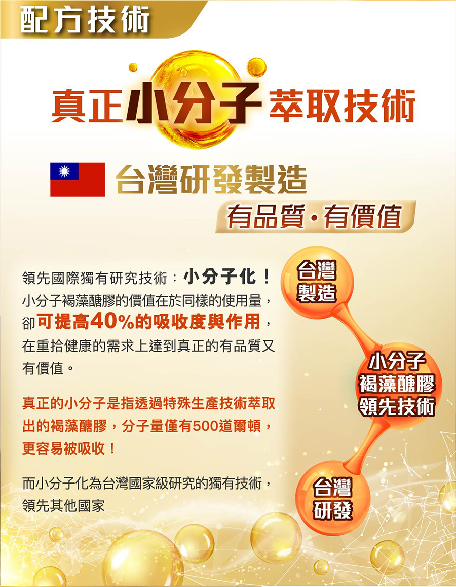 | Main Ingredients | ✓ Extraction from Natural Fucoidan.High Quality.Safety Fucoidan is a kind of water-soluble polysaccharides mainly composed of Fucose extracted from oceanic brown seaweed. It has been proven to have a sound auxiliary mechanism for maintaining health; long-term consumption can relieve fatigue, improve appetite and immunity. Seaweed contains rich nutrition components, including that human needed such as carbohydrate, protein, amino acids, vitamin (B1、B2、B12、C), carotenoid and many minerals which cannot be provided by vegetables on land (such as iodine, calcium, manganese, zinc, potassium, magnesium, iron, and selenium). And its fat content is extremely low (about accounted for 0.2-2% around), therefore, it is regarded as natural health food with balanced nutrition. For hundreds of years, Brown seaweed, the largest seaweeds in size has been considered as one of the best source of natural nutrition food. Most brown algae contains Fucoxanthin, showing yellowish brown color on its body. Also, there is a sticky ingredient extracted from brown seaweed which is mainly composed of sulfated polysaccharide, and is a kind of water-soluble fiber, often called "Fucoidan”. ✓ Low Molecular Extraction Biotechnology Made in Taiwan Quality and Valuable Fucoidan is extracted by low molecular biotechnology from high quality, natural and precious brown seaweed in the ocean, which is suitable for human health and physical fitness with high purity and effectiveness. The brown seaweed is selected in the pure oceanic area, and the molecular weight technology is exclusively authorized by the Taiwan Fisheries Research Institute, Taiwan Executive Yuan (COA). The low molecular weight Fucoidan is about 500 Daltons, which is easily to be absorbed; with 40% higher bioactivity than other general Fucoidan. It is a very safe and high purity Fucoidan. In review of other sources of fucoidan in foreign countries, there are problems of heavy metal residues, algae smell and other issues, like contamination of radiation. |