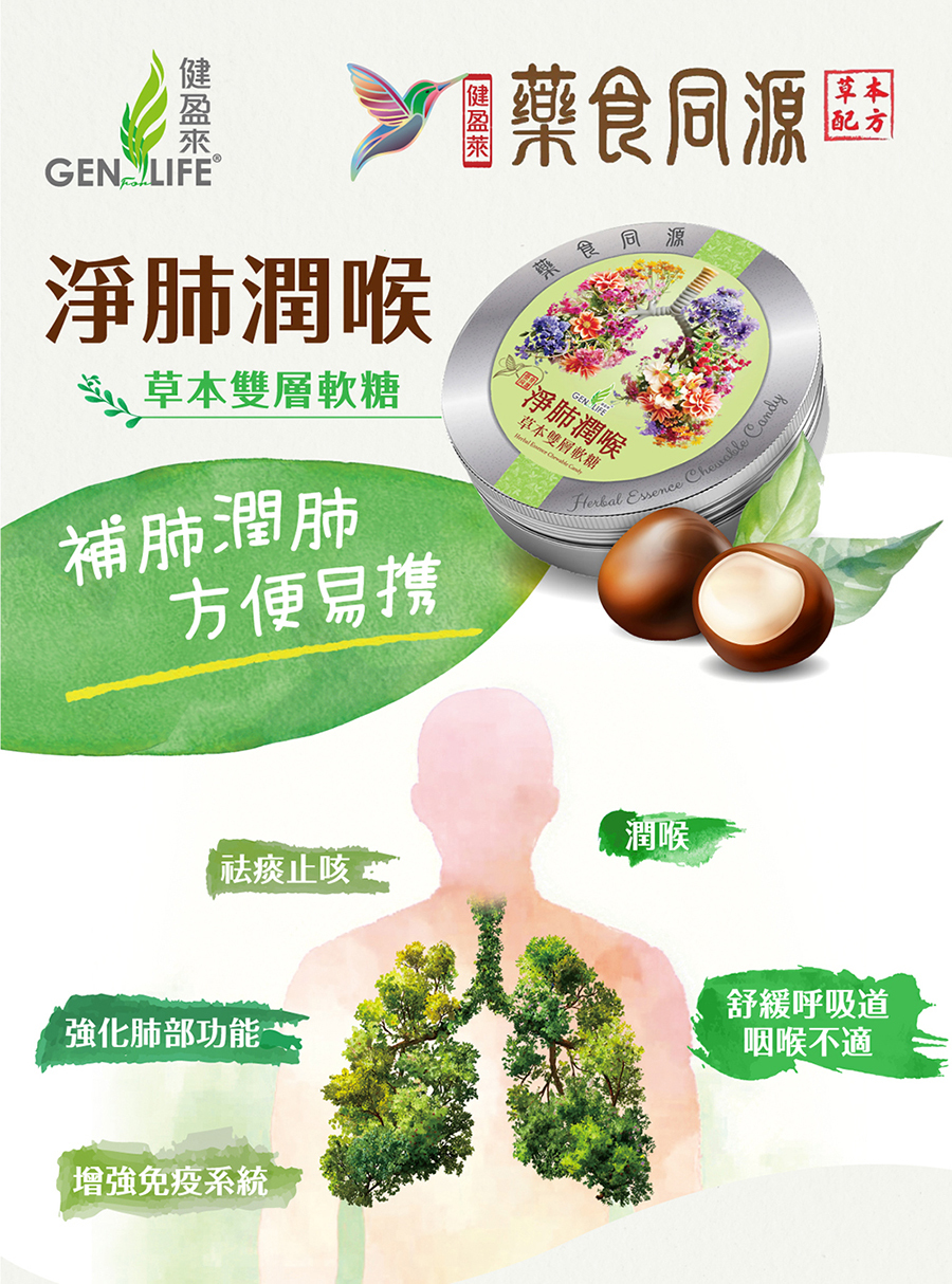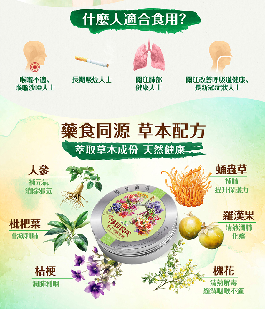 | 主要成份 | 人參 - 補元氣、消除邪氣 枇杷葉 - 化痰利肺 桔梗 - 潤肺利咽 蛹蟲草 - 補肺、提升保護力 羅漢果 - 清熱潤肺、化痰 槐花 - 清熱解毒、緩解咽喉不適 |